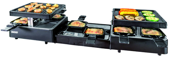 ausziehbares Raclette - dadurch perfekt anpassbar an kleine und größere Tische, 2 separate Grillflächen mit abnehmbaren, antihaftbeschichteten Grillplatten (ca. 21 cm x 21 cm), zusätzliche Ablagefläche für die Pfännchen, wenn das Gerät ausgezogen ist bzw. als praktisches Aufbewahrungsfach, antihaftbeschichtete Pfännchen mit wärmeisolierten Griffen, 8 Holzspatel, Ein-/Ausschalter mit Kontrollleuchte