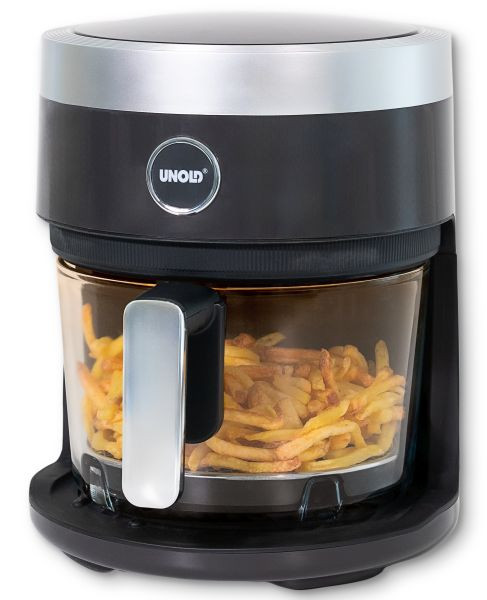 Heißluftfritteuse, gesundes Frittieren, Grillen, Garen, Braten, Dörren, Backen, Warmhalten, Erhitzen, Auftauen oder Rösten, Frittierkorb aus Glas für eine optimale Sicht auf den Garprozess, ca. 3,5 l Fassungsvermögen für ca. 800 g PommesFrites, inkl. 2 verschiedener Gareinsätze und praktischer Silikonmatte als Unterlage zum sicheren Abstellen des Frittierkorbs, 10 Automatikprogramme auf Knopfdruck: Pommes frites, Steak, Fisch, Shrimps, Chicken Wings, Würstchen, Brot, Dörren, Auftauen sowie ein Eigenprogramm, Temperatureinstellungen von 65- 200°C, Touch-Display, Timer für 1-60 Min., Abschaltautomatik, Sicherheitsabschaltung, Rezpetheft, Frittierbehälter und Zubehör spülmaschinengeeignet