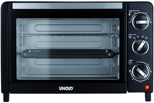 3 Einschubebenen, Backblech, Grillrost, Grillrostheber, 4 Edelstahl-Heizelemente, Ober/Unterhitze, auch getrennt regelbar, einstellbare Temperatur von 100 bis 220 °C, 60-Min. Timer, akustisches Fertigsignal, Innenbeleuchtung, Betriebskontrollleuchte, hitzeisoliertes Gehäuse - gemäß neuester EU Norm zur Energieeinsparung