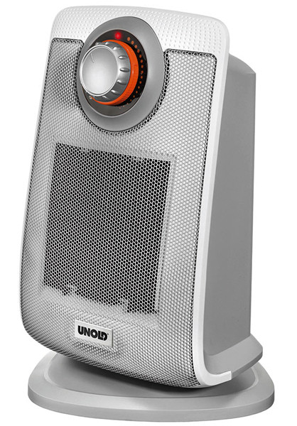 PTC-Keramik Heizelement, 4 Stufen: Aus, Ventilation, Warmluft, Heißluft; Ein-/Ausschalter, Thermostat mit stufenloser Temperaturregelung, 75° oszillierend, Kipp-Schutz/Auto off = Sicherheitsabschaltung, tropfwassergeschützt, Schutzklasse IP21 , Tragegriff im Gehäuse