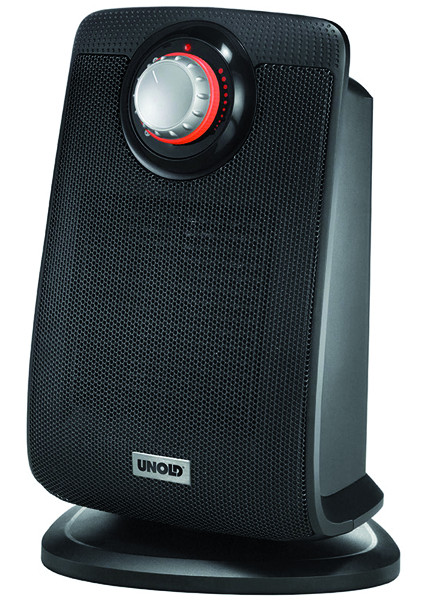 PTC-Keramik Heizelement, 4 Stufen: Aus, Ventilation, Warmluft, Heißluft; Ein-/Ausschalter, Thermostat mit stufenloser Temperaturregelung, 75° oszillierend, Kipp-Schutz/Auto off = Sicherheitsabschaltung, tropfwassergeschützt, Tragegriff im Gehäuse