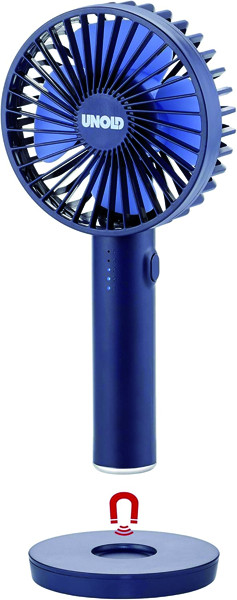 akkubetriebener Handventilator, magnetischer Standfuß mit integriertem Spiegel, 5-stufige Geschwindigkeitsregelung per Knopfdruck, LED-Kontrollleuchte, Li-Ion-Akku, Akkubetrieb je nach Stufe ca. 2 - 8 Stunden, Akkuladezeit ca. 3 Std., inklusive USB-Ladekabel