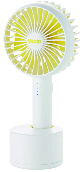 akkubetriebener Handventilator, Standfuß mit 120° zuschaltbarer Oszillation, 5-stufige Geschwindigkeitsregelung per Knopfdruck, LED-Kontrollleuchte, Li-Ion-Akku, Akkubetrieb je nach Stufe ca. 2 - 8 Stunden, Akkuladezeit ca. 3 Std., inklusive USB-Ladekabel