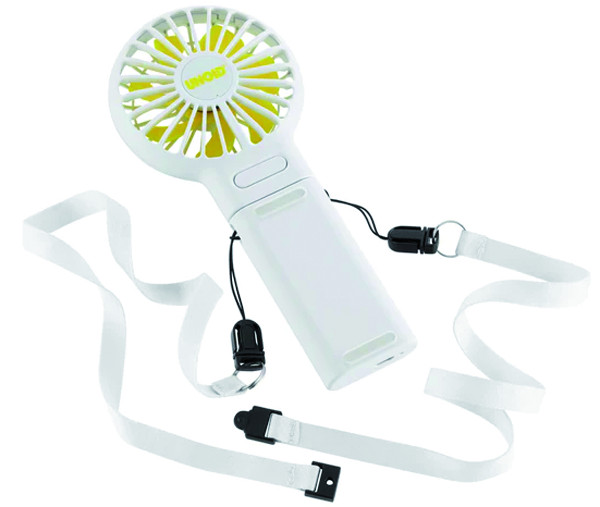 akkubetriebener Handventilator zum Aufstellen oder Umhängen, maximaler Klappwinkel ca. 180°, 3-stufige Geschwindigkeitsregelung per Knopfdruck, Li-Ion-Akku, Akkubetrieb je nach Stufe ca. 3,5 - 10 Stunden, Akkuladezeit ca. 5 Std., inklusive USB-Ladekabel und praktischem Umhängeband