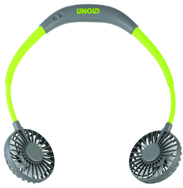 akkubetriebener flexibler Nackenventilator, bequemer Nackenbügel sorgt für freie Hände während der Benutzung, dank flexiblem Schwanenhals kann der Ventilator in verschiedene Richtung geneigt werden, zuschaltbare LED-Beleuchtung auf Rotorblätter (Aus/Farbwechsel/Dauerfarbe), inklusive Sicherheitsnetz - Schutz vor Verfangen längerer Haare, 3-stufige Geschwindigkeitsregelung per Knopfdruck, LED-Kontrollleuchte, Li-Ion-Akku, Akkubetrieb je nach Stufe ca. 2 - 8 Stunden, Akkuladezeit ca. 3 Std., inklusive USB-Ladekabel, platzsparende Aufbewahrung