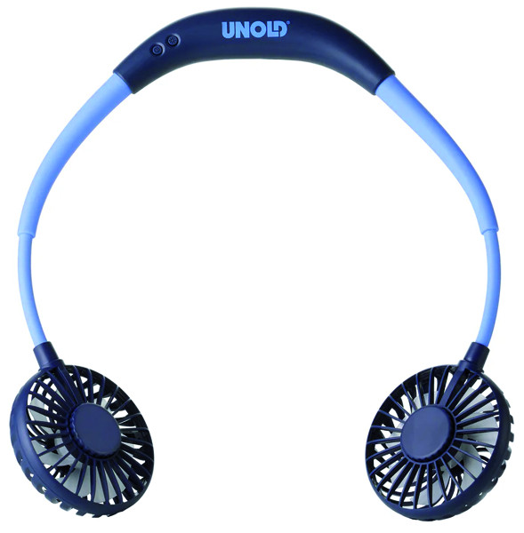 akkubetriebener flexibler Nackenventilator, bequemer Nackenbügel sorgt für freie Hände während der Benutzung, dank flexiblem Schwanenhals kann der Ventilator in verschiedene Richtung geneigt werden, zuschaltbare LED-Beleuchtung auf Rotorblätter (Aus/Farbwechsel/Dauerfarbe), inklusive Sicherheitsnetz - Schutz vor Verfangen längerer Haare, 3-stufige Geschwindigkeitsregelung per Knopfdruck, LED-Kontrollleuchte, Li-Ion-Akku, Akkubetrieb je nach Stufe ca. 2 - 8 Stunden, Akkuladezeit ca. 3 Std., inklusive USB-Ladekabel, platzsparende Aufbewahrung