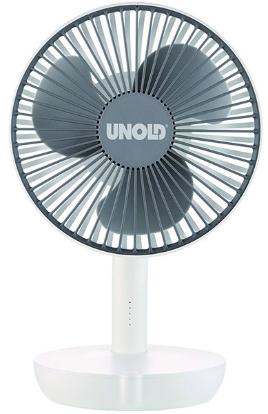 akkubetriebener Tischventilator, als Powerbank nutzbar: ermöglicht das Aufladen von mobilen Geräten wie bspw. Smartphones, Kopfhörer, usw. 5-stufige Geschwindigkeitsregelung per Knopfdruck, Neigungswinkel verstellbar, LED-Kontrollleuchte, Li-Ion-Akku, Akkubetrieb je nach Stufe ca. 3,5 - 14 Stunden, Akkuladezeit ca. 6 Std.