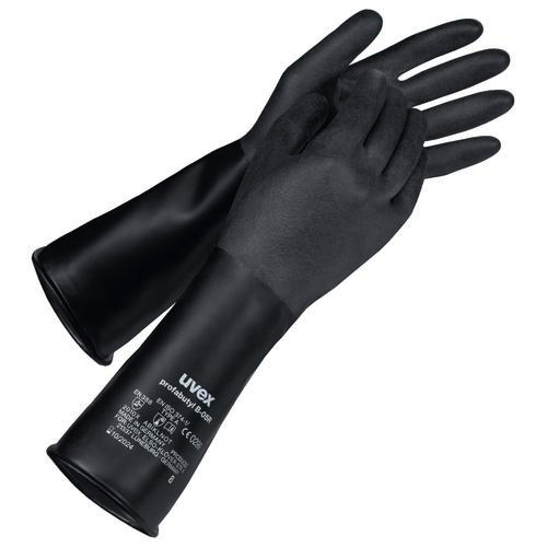 Aus 100 Prozent Butylkautschuk gefertigt eignen sich uvex profabutyl Chemikalienschutzhandschuhe vor allem für den Umgang mit polaren Verbindungen wie Ester oder Ketone.