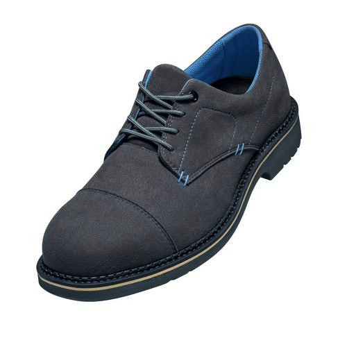 Ob im Büro oder in der Werkhalle - die lässigen uvex 1 business Sicherheitshalbschuhe lassen sich sowohl zur Chino, zum Anzug als auch zur Arbeitshose stilvoll kombinieren. Nach außen hin erscheinen die uvex 1 business Schnürschuhe aus grauem Mikrovelours im klassischen Look. Die hellgrauen Schnürsenkel, die raffinierten Ziernähte in Hellblau und die markante Sohlennaht verleihen den Schnürschuhen zudem moderne Details.