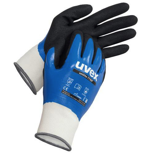 Die nahtlosen Montagehandschuhe uvex unilite 7710F aus Polyester, sind dank ihrer Beschaffenheit und der vollflächigen NBR-Beschichtung mit Grip-Finish an den Handinnenflächen ideal für Arbeiten in trockenen, feucht-nassen und öligen Umgebungen geeignet.