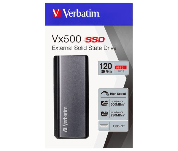 Verbatim Vx500 Externes SSD-Laufwerk, USB 3.1 Gen 2, 120 GB, USB Typ-C, Lesegeschwindigkeit 500 MB/s, Schreibgeschwindigkeit 440 MB/s.
