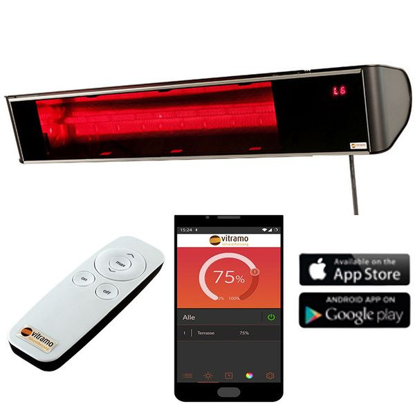 Dabei wird die erforderliche Wärmemenge ganz einfach per Bluetooth App oder Infrarot Fernbedienung reguliert. Mit der kostenlosen Smartphone App für iOS und Android ist der Heizstrahler stufenlos von 0 - 100% per touch dimmbar. Die Infrarot-Fernbedienung schaltet neben Ein/Aus das Gerät in sechs fein abgestimmten Heizstufen. Darüber hinaus können über Bluetooth App und Fernbedienung auch mehrere Infrarot-Heizstrahler (bis zu 6 Stück) parallel gesteuert werden. Das Heizgerät verfügt über einen eingebauten Ein/Aus-Hauptschalter am Gehäuse.