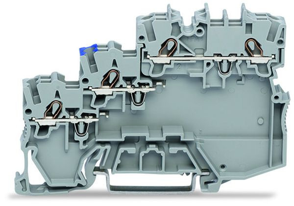 3-Leiter-Aktorenklemme; für PNP-(plus-)schaltende Aktoren; mit PE über Kammbrücker; mit farbig bedruckten Leitereinführungen; 1 mm²; Push-in CAGE CLAMP®; 1,00 mm²; grau