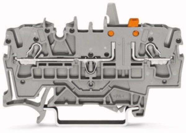 2-Leiter-Trenn- und Messklemme; mit mechanischer Verriegelung; mit Prüfmöglichkeit; Trennmesserhalter orange; für Tragschiene 35 x 15 und 35 x 7,5; 2,5 mm²; Push-in CAGE CLAMP®; 2,50 mm²; grau