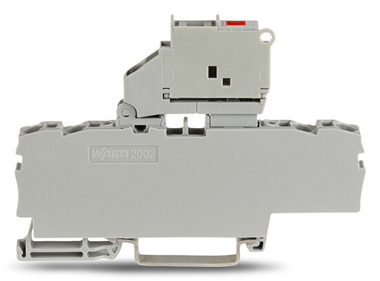 4-Leiter-Sicherungsklemme; mit schwenkbarem Sicherungshalter; mit Abschlussplatte; für G-Sicherungseinsatz 5 x 20 mm; mit Defektanzeige durch LED; 120 V; für Tragschiene 35 x 15 und 35 x 7,5; 2,5 mm²; Push-in CAGE CLAMP®; 2,50 mm²; grau