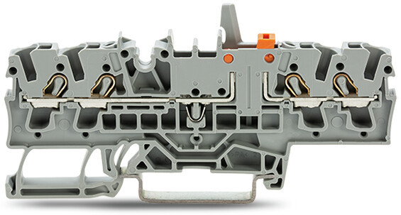 4-Leiter-Trenn- und Messklemme; mit mechanischer Verriegelung; mit Prüfmöglichkeit; Trennmesserhalter orange; für Tragschiene 35 x 15 und 35 x 7,5; 2,5 mm²; Push-in CAGE CLAMP®; 2,50 mm²; grau