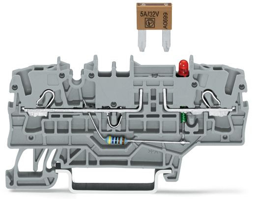 2-Leiter-Sicherungsklemme; für Kfz-Mini-Flachsicherungen; mit Prüfmöglichkeit; mit Defektanzeige durch LED; 48 V; für Tragschiene 35 x 15 und 35 x 7,5; 2,5 mm²; Push-in CAGE CLAMP®; grau