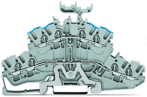 4-Leiter-Doppelstockklemme; Schirmleiter-/Durchgangsklemme; 2,5 mm²; Schirmung/L; ohne Beschriftungsträger; Leitereinführung OG, blau bedruckt; für Tragschiene 35 x 15 und 35 x 7,5; Push-in CAGE CLAMP®; 2,50 mm²; grau