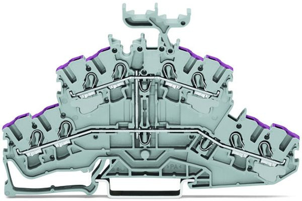 4-Leiter-Doppelstockklemme; 8-Leiter-Durchgangsklemme; L; mit Beschriftungsträger; intern gebrückt; Leitereinführung violett bedruckt; für Tragschiene 35 x 15 und 35 x 7,5; 2,5 mm²; Push-in CAGE CLAMP®; 2,50 mm²; grau