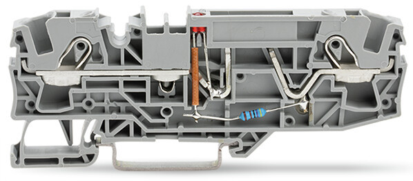 2-Leiter-Sicherungsklemme; für Kfz-Flachsicherungen; mit Prüfmöglichkeit; mit Defektanzeige durch LED; 24 V; für Tragschiene 35 x 15 und 35 x 7,5; 6 mm²; Push-in CAGE CLAMP®; grau