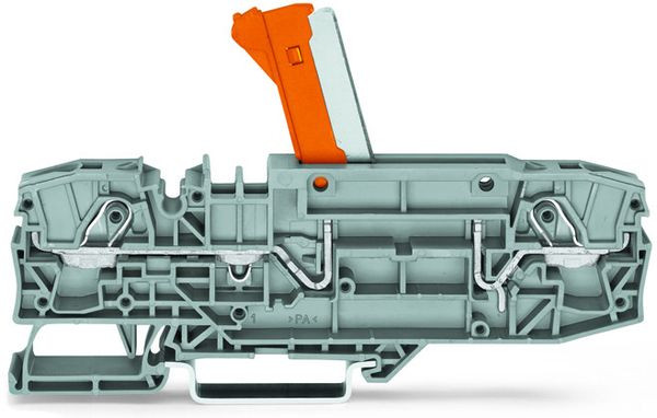 2-Leiter-Trenn- und Messklemme; mit schwenkbarem Trennmesser; mit Prüfmöglichkeit; Trennmesserhalter orange; für Tragschiene 35 x 15 und 35 x 7,5; 6 mm²; Push-in CAGE CLAMP®; 6,00 mm²; grau