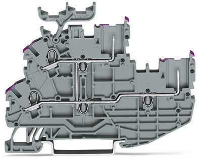 2-Leiter/1-Pin-Doppelstock-Basisklemme; 2-Leiter/2-Pin-Durchgangsklemme; L; intern gebrückt; Leitereinführung violett bedruckt; für Tragschiene 35 x 15 und 35 x 7,5; Push-in CAGE CLAMP®; 1,00 mm²; grau