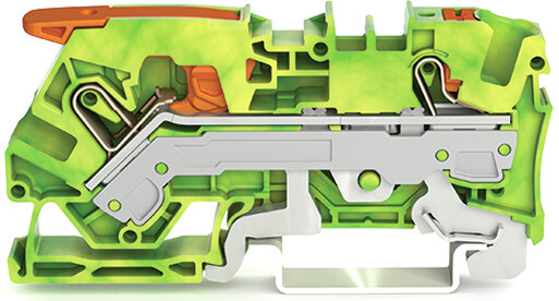 2-Leiter-Schutzleiterklemme; mit Hebel und Drücker; 6 mm²; mit Prüföffnung; seitliche und mittige Beschriftung; für Tragschiene 35 x 15 und 35 x 7,5; Push-in CAGE CLAMP®; 6,00 mm²; grün-gelb