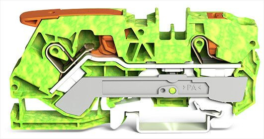 2-Leiter-Schutzleiterklemme; mit Hebel und Drücker; 10 mm²; mit Prüföffnung; seitliche und mittige Beschriftung; für Tragschiene 35 x 15 und 35 x 7,5; Push-in CAGE CLAMP®; 10,00 mm²; grün-gelb