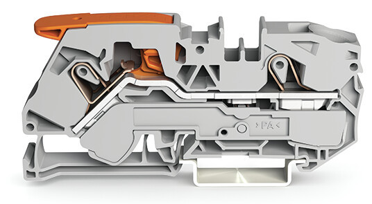 2-Leiter-Durchgangsklemme; mit Hebel und Push-in CAGE CLAMP®; 16 mm²; mit Prüföffnung; seitliche und mittige Beschriftung; für Tragschiene 35 x 15 und 35 x 7,5; Push-in CAGE CLAMP®; 16,00 mm²; grau