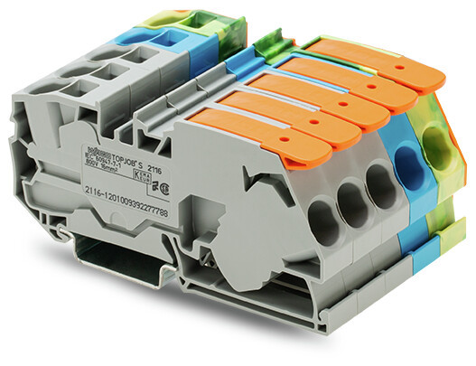 Drehstromset; mit orangefarbener Abschlussplatte; mit 2-Leiter-Reihenklemmen; mit Hebel und Betätigungsöffnung; 16 mm²; Push-in CAGE CLAMP®; 16,00 mm²; grau/blau/grün-gelb
