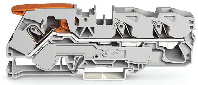 3-Leiter-Durchgangsklemme; mit Hebel und Push-in CAGE CLAMP®; 16 mm²; mit Prüföffnung; seitliche und mittige Beschriftung; für Tragschiene 35 x 15 und 35 x 7,5; Push-in CAGE CLAMP®; 16,00 mm²; grau