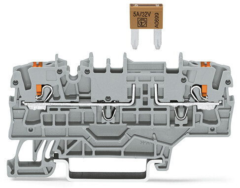 2-Leiter-Sicherungsklemme; für Kfz-Mini-Flachsicherungen; gemäß DIN 7258-3f, ISO 8820-3; mit Prüfmöglichkeit; mit zusätzlicher Brückung; ohne Defektanzeige; mit Drücker; 2,5 mm²; Push-in CAGE CLAMP®; grau