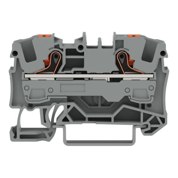 2-Leiter-Durchgangsklemme; mit Drücker; 6 mm²; mit Prüföffnung; für Anwendungen Ex e II geeignet; seitliche und mittige Beschriftung; für Tragschiene 35 x 15 und 35 x 7,5; Push-in CAGE CLAMP®; 6,00 mm²; grau
