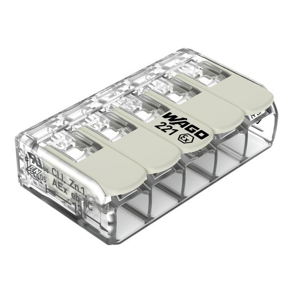 Verbindungsklemme mit Hebeln; für alle Leiterarten; für Anwendungen Ex e; max. 6 mm²; 5 Leiter; Gehäusefarbe transparent; Betriebstemperatur max. 105 °C; 6,00 mm²; transparent