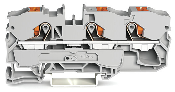 3-Leiter-Durchgangsklemme; mit Drücker; 10 mm²; mit Prüföffnung; seitliche und mittige Beschriftung; für Tragschiene 35 x 15 und 35 x 7,5; Push-in CAGE CLAMP®; 10,00 mm²; grau
