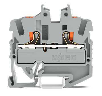 2-Leiter-Mini-Durchgangsklemme; mit Drücker; 2,5 mm²; mit Prüföffnung; seitliche und mittige Beschriftung; für Tragschiene 15; Push-in CAGE CLAMP®; 2,50 mm²; grau