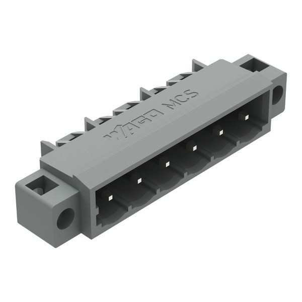 THT-Stiftleiste; Lötstift 1,2 x 1,2 mm; abgewinkelt; Befestigungflansch; Rastermaß 5 mm; 5-polig; grau