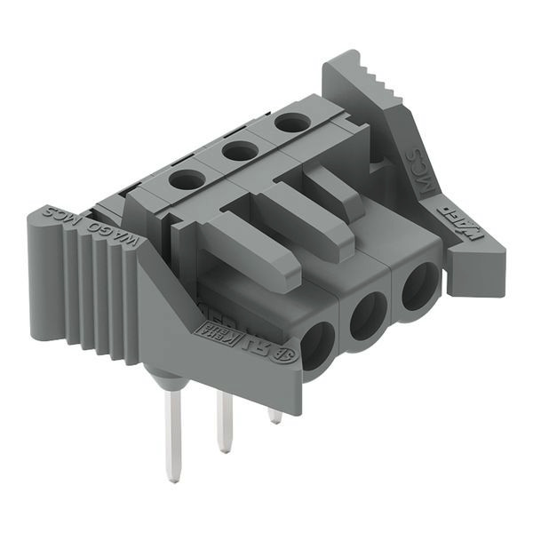 Federleiste für Reihenklemmen; Stifte 0,6 x 1 mm; abgewinkelt; Verriegelungsklinke; Rastermaß 5 mm; 3-polig; grau