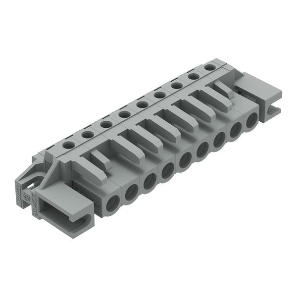 THT-Federleiste; abgewinkelt; Rastermaß 5 mm; 9-polig; Distanzflansch; Lötstift 0,6 x 1,0 mm; grau
