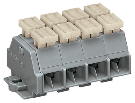 4-Leiter-Klemmenleiste; beidseitig mit Drückern; mit Befestigungsflanschen; 4-polig; für Schraub- u.ä. Befestigungsarten; Befestigungsloch Ø 3,2 mm; 2,5 mm²; CAGE CLAMP®; grau