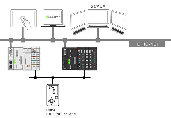 - Verwendung der PFC200-Steuerung als DNP3-Master zum Lesen und Verarbeiten der Daten von DNP3-Slaves (Feldgeräten) über TCP, UDP oder seriell.