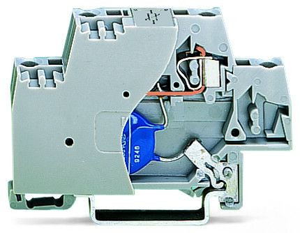 Diese Bauelementklemme mit einstufigem Überspannungsableiter, Abschlussplatte und direkter Ableitung auf die Tragschiene 35 ist mit einem Varistor bestückt.