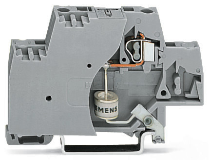 Diese Bauelementklemme mit einstufigem Überspannungsableiter, Abschlussplatte und direkter Ableitung auf die Tragschiene 35 ist mit einem Gasableiter bestückt.