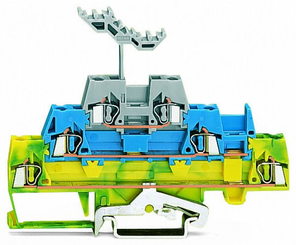 Dreistockklemme; Schirmleiter-/Durchgangs-/Durchgangsklemme; 2,5 mm²; mit Beschriftungsträger; für Tragschiene 35 x 15 und 35 x 7,5; CAGE CLAMP®; 2,50 mm²; grün-gelb/blau/grau