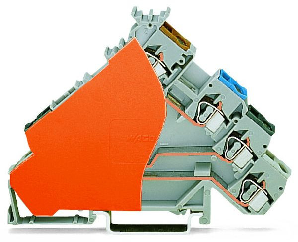 4-Leiter-Initiatorenklemme; für PNP (plus)-schaltende Initiatoren; für Sicherungsstecker; mit orangefarbener Abschlussplatte; mit farbig bedruckten Leitereinführungen; 2,5 mm²; CAGE CLAMP®; 2,50 mm²; grau