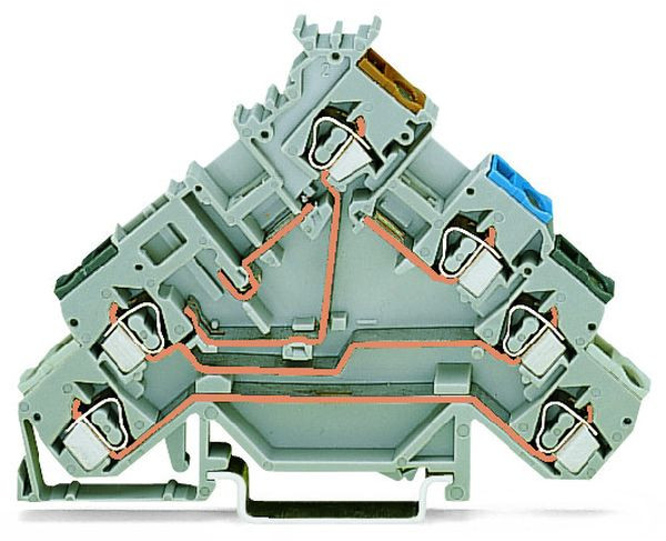 4-Leiter-Initiatorenklemme; für PNP (plus)-schaltende Initiatoren; für Sicherungsstecker; ohne Abschlussplatte; mit farbig bedruckten Leitereinführungen; 2,5 mm²; CAGE CLAMP®; 2,50 mm²; grau