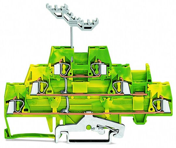 Dreistockklemme; 6-Leiter-Schutzleiterklemme; 2,5 mm²; mit Beschriftungsträger; intern gebrückt; für Tragschiene 35 x 15 und 35 x 7,5; CAGE CLAMP®; 2,50 mm²; grün-gelb