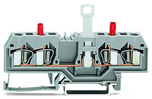 2-Leiter-Trenn- und Messklemme; mit berührungssicheren Prüfbuchsen; für Tragschiene 35 x 15 und 35 x 7,5; 4 mm²; CAGE CLAMP®; 4,00 mm²; grau