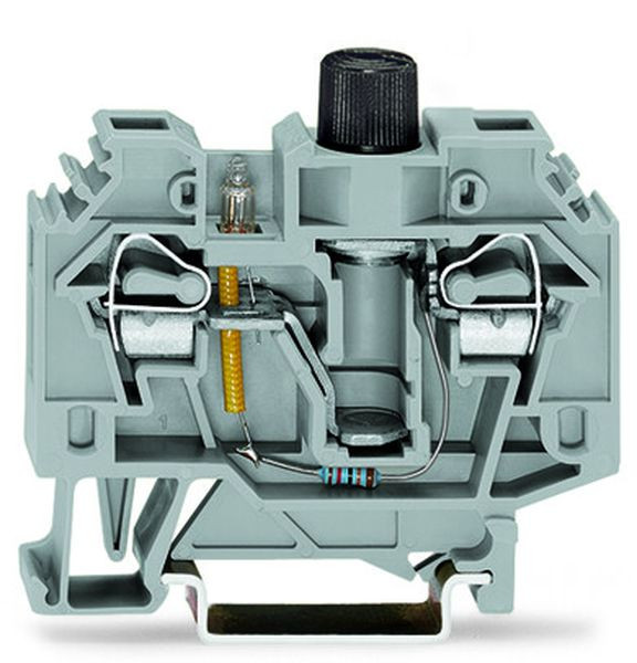 2-Leiter-Sicherungsklemme; für G-Sicherungseinsatz ¼" x 1¼"; mit Defektanzeige durch Glimmlampe; für Tragschiene 35 x 15 und 35 x 7,5; 6 mm²; CAGE CLAMP®; grau