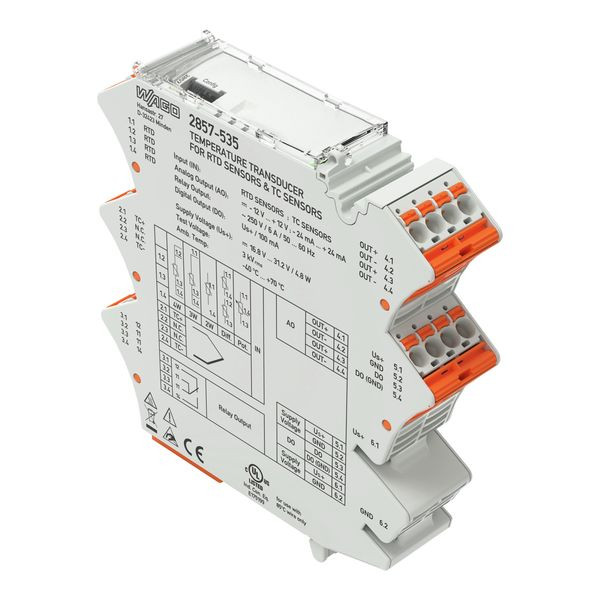 Der RTD-TC-Temperaturmessumformer für RTD-Sensoren, Potentiometer, Widerstände und Thermoelemente dient zum Überwachen und zum Melden von Signalzuständen von bis zu 2 Schaltschwellen. Zusätzlich werden die erfassten Sensor- bzw. Zustandsinformationen in ein analoges Standardsignal gewandelt.